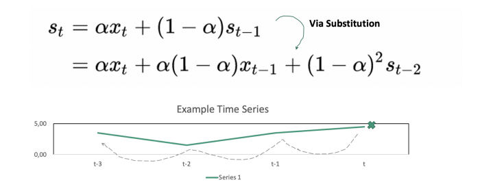 The formula for simple exponential smoothing is given below. It consists of a single parameter alpha, which determines how much of the time series history is used to forecast the next value. As you can see, the formula is also recursive. S_t-1 depends on S_t-2 and so on. This recursion is illustrated in the diagram. In the end, it is basically a weighted average of past values where the weights decrease exponentially over time.
