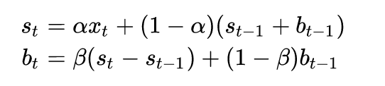 Double Exponential smoothing introduces a new formula b_t and a new parameter Beta. As shown in the formula, b_t is related to beta*(s_t-st_1). Effectively, this represents the difference between the last smoothing statistic and the current smoothing statistic, and allows the model to capture trends. If we now retrain the model including a beta value, we get the following forecast.