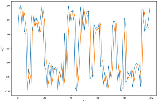 However, what happens when we try to train a Simple Exponential Smoothing model on a time series with a trend? The image below shows a new time series (t2, in blue). The forecast is shown in orange. You can see that the forecast doesn’t capture the upward trend, because it is based on a weighted sum of past values.