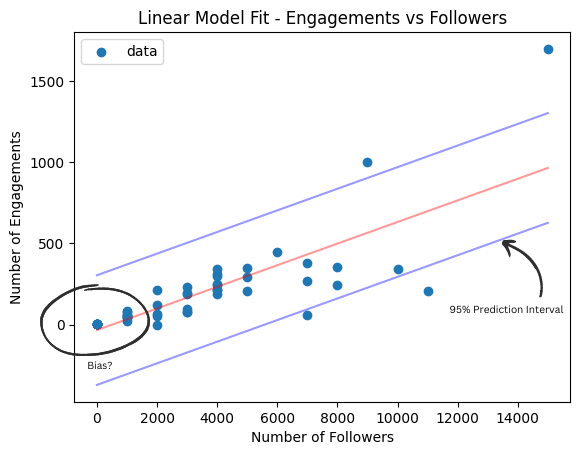 Secondly, take a closer look at the observations with fewer followers. It shoots a little low. The absolute error is still small but the model intercept skews low to compensate for the extra weight on observations with many followers. In percentage terms this error could be quite significant for some observations. Whether that’s a problem is debatable but it could be serious depending on the business context.