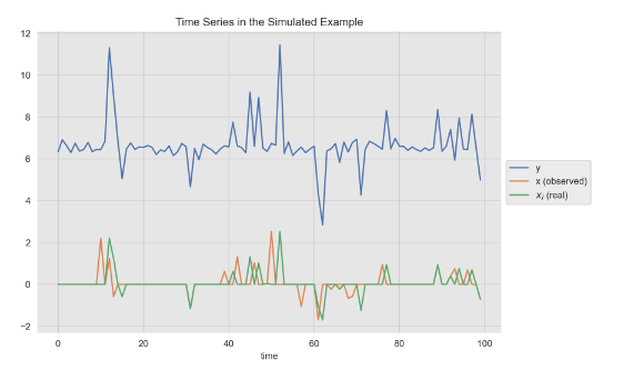 number of time specific complexities arise. For the specific case where the input x affects the output y, with a random time delay in between, the estimated coefficients (or weights, predictions etc) are significantly attenuated. This attenuation occurs both in traditional statistical models and machine learning models, and for certain problems can be a serious limitation. The image below shows an example of stochastic time delay.