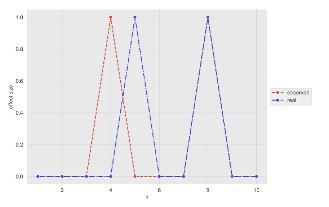 The image above shows the two time series, x and y. The green line represents the real series and the orange line represents the the shifted series, corresponding to the time at which the effect occurs.
