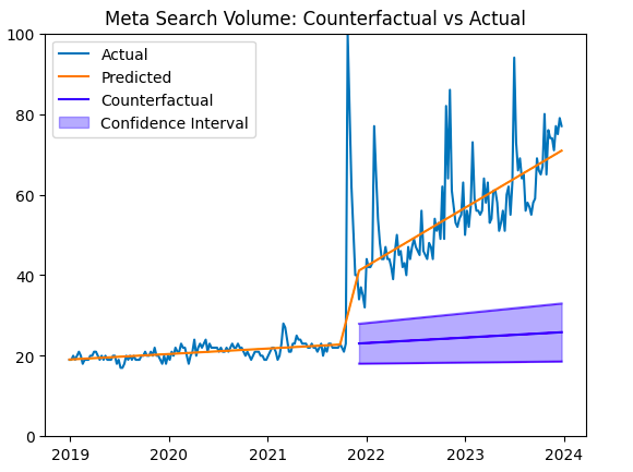 Based on the counterfactual, the expected search volume for the word ‘meta’ was ~2600 to EOY 2023. However, after the name change, search volume for ‘meta’ was actually about 6000. Therefore, there was an 130% increase in searches due to the name change.