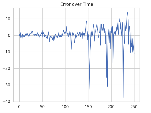 The plot on the right shows the error over time. While the mean consistently hovers around zero there are some autocorrelated deviations, particularly at the end. These deviations are linked to the autocorrelation that we found in the PACF plot. Finally, the errors increase after the name change - we have heteroscedasticity.