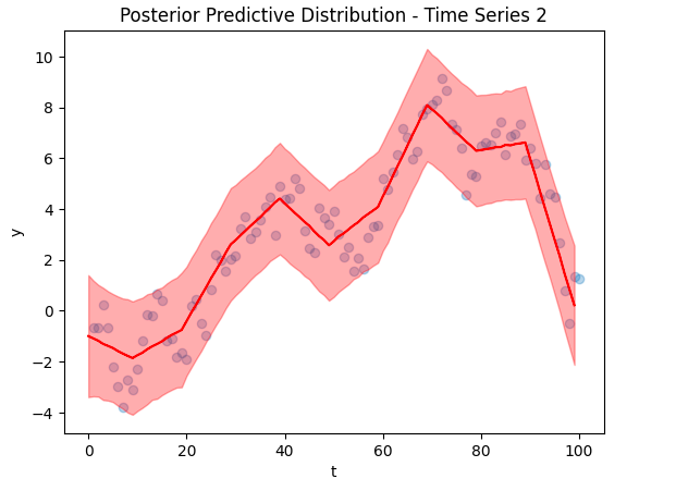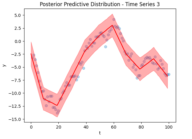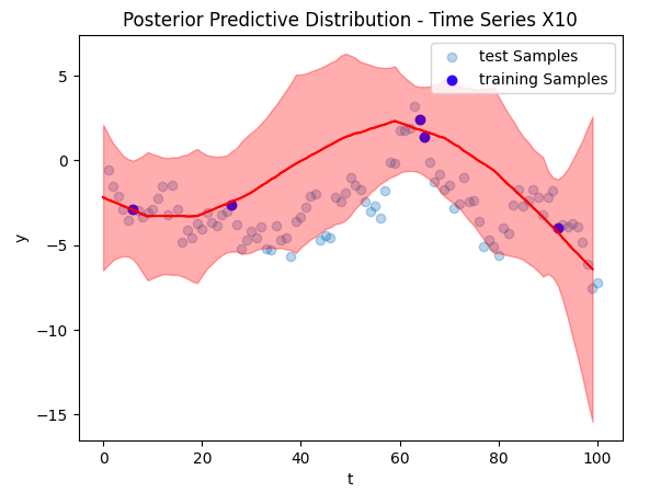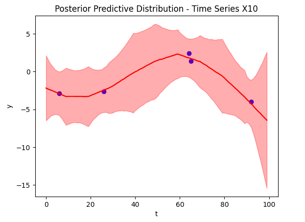 Now to the crux of the article, our time series reconstruction! The figure below shows the reconstruction in red, with the deleted data points overlaid in blue. The posterior predictive distribution is the light red shaded region. Despite training on only 5 data points (and other time series), we were able to find an accurate reconstruction.