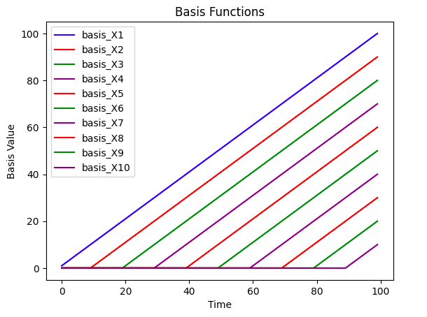 To effectively model the time series, we’ll create 10 linear basis functions that are equally distributed across time. The basis functions are plotted below below. Each individual time series will be modelled as a linear combination of the bases multiplied by their coefficients.