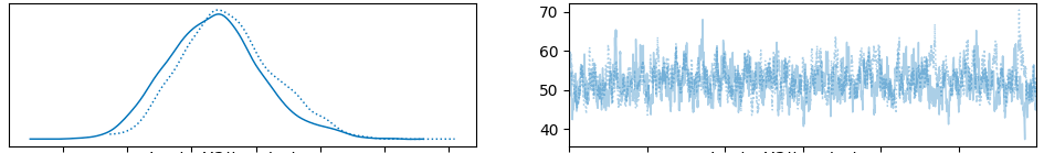 Finally, here is the chain for the first basis function \beta. Notice on the left that there is one normal distribution per time series, while the collection of these distributions is also normally distributed. This is consistent with our hierarchical specification of the model.