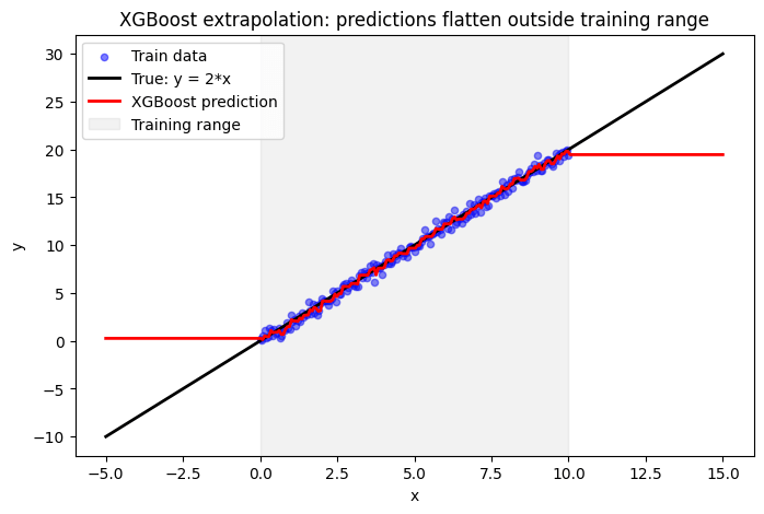 Despite being a machine learning powerhouse, XGBoost has a significant weakness: extrapolation. Extrapolation is the ability of a model to make predictions for data that falls outside the range of what it was trained on. This can be a serious problem when you’re working with time-series data or when your data-generating process changes over time. This is surprisingly common in real-world scenarios, as the world is constantly changing! This weakness in extrapolation is shared by all tree-based models that use constant functions between split points, e.g., Random Forest, XGBoost, LightGBM, etc.